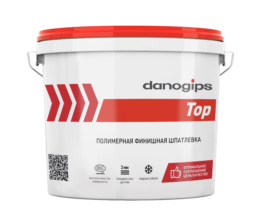 Danogips TOP – готовая к применению финишная пастообразная полимерная шпатлевка. Применяется в сухих помещениях для подготовки основания под высококачественную отделку, в том числе оклейку тонкими/светлыми обоями и окраску. Подходит для финишного выравнивания листовых материалов, ранее ошпатлеванных или окрашенных поверхностей, пазогребеневых плит, стеклохолста и др.