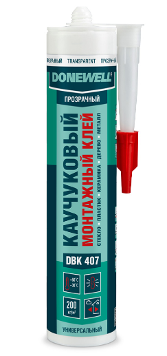 Прозрачный каучуковый клей «жидкие гвозди» DONEWELL® DBK-407 существенно ускоряет отделочные работы, экономичен и прост в использовании. Может наноситься при температуре не ниже +5°С.