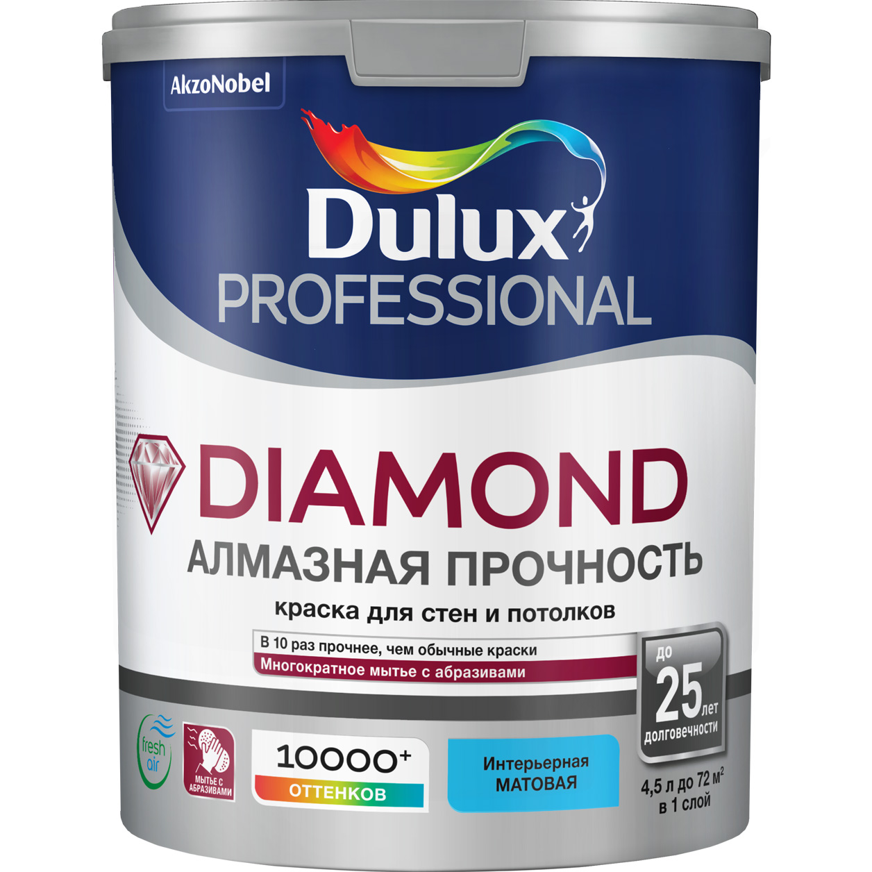 Водно-дисперсионная износостойкая матовая краска для стен и потолков. Уникальная технология Diamond обеспечивает экологичность водной краски и прочность алкидного покрытия. Образует идеально гладкое и ровное покрытие, а благодаря матовой текстуре и отличной укрывистости, скрывает небольшие дефекты поверхности. Легко наносится, не образуя потеков, почти не пахнет. Срок службы покрытия до 25 лет (подтверждено независимыми исследованиями). Экологичность подтверждена эко-сертификатом "Листок Жизни". Сертифицирована для применения в детских и лечебно-профилактических учреждений. Для внутренних работ. Подходит для нанесения на полностью просохшие минеральные поверхности (бетон, штукатурку, кирпич и т. п.), гипсокартон, обои под покраску, ДВП. Рекомендуется для окраски помещений с умеренной влажностью, таких как спальни, гостиные, кабинеты кладовки, кабинет, застекленный балкон и т.д., а также помещений с высокой эксплуатационной нагрузкой, например, холлов, коридоров, лестничных пролетов, раздевалок.