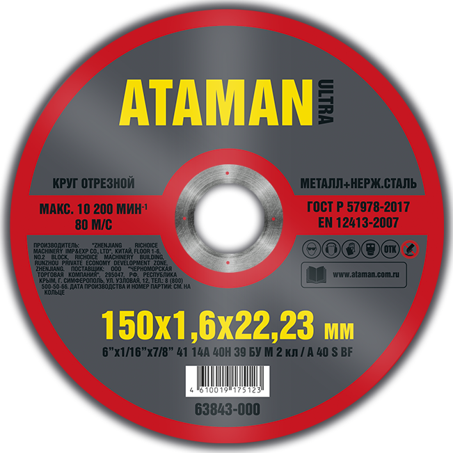 Круг отрезной по металлу 150*1,6*22 мм 41 14А ATAMAN