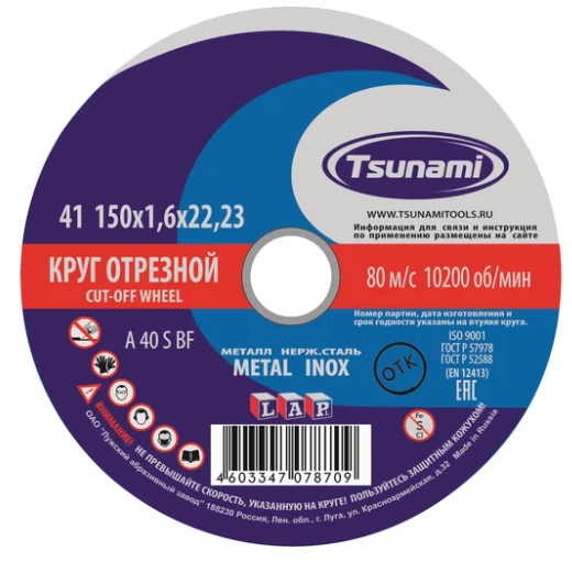 Круг отрезной по металлу 150*1,6*22 мм A40 S BF L TSUNAMI