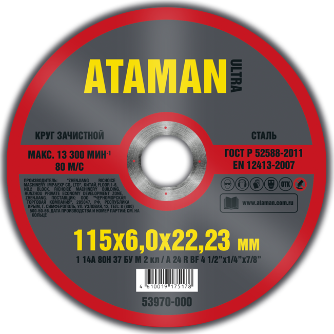 Круг зачистной по металлу 115*6*22 мм 1 14А ATAMAN
