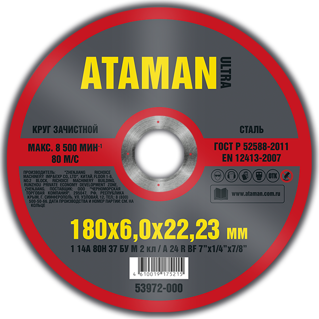 Круг зачистной по металлу 180*6*22 мм 1 14А ATAMAN