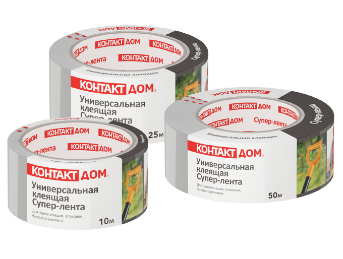 Универсальная клеящая супер-лента ''Контакт'' выполнена по трехслойной технологии (ПЭВД-пленка, полиэстеровая сетка, клеевой слой на основе синтетического каучука). Лента удобна для применения без режущего инструмента (легко надрывается руками поперек).