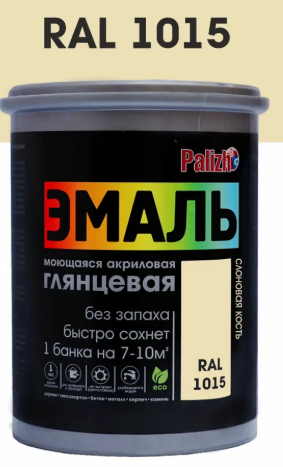 Эмаль акриловая универсальная цвет Слоновая кость RAL 1015 предназначена для фасадных и интерьерных работ по кирпичным, бетонным, оштукатуренным, деревянным поверхностям, гипсокартону, обоям и др.материалам. Подходит для окрашивания металлических поверхностей после предварительного грунтования. Так же применяется для обновления мебели и других предметов интерьера. Легко наносится, образует абсолютно гладкую, глянцевую поверхность, устойчивую к атмосферным воздействиям и мытью. Не содержит растворителей. Может колероваться универсальными колеровочными пастами, ввод пасты до 5%. Наносить в 1-3 слоя. Расход 110-170 г/м² на 1 слой, расход зависит от качества подготовки, впитывающей спопобности и рельефа поверхности. Эмаль устойчива к мытью через 7 дней после нанесения.