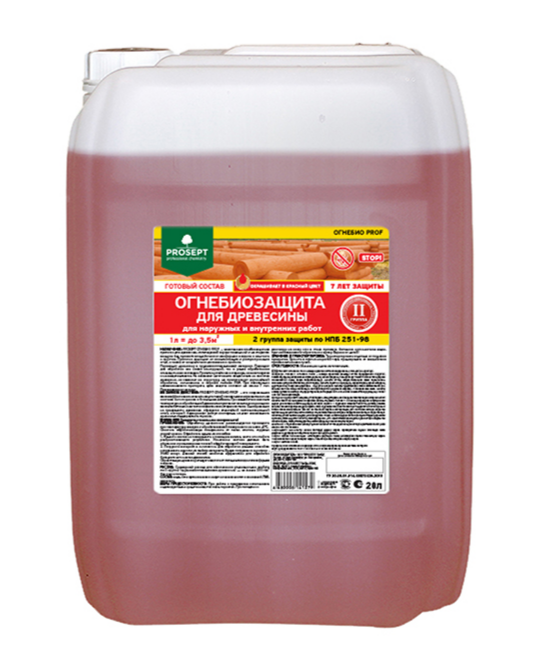 PROSEPT ОГНЕБИО PROF – комплексная огнебиозащитная пропитка для древесины, используемой внутри помещений и на открытом воздухе без прямого воздействия атмосферных осадков и контакта с грунтом. Пропитка защищает от возникновения и распространения огня, а также от воздействия насекомых и грибков.