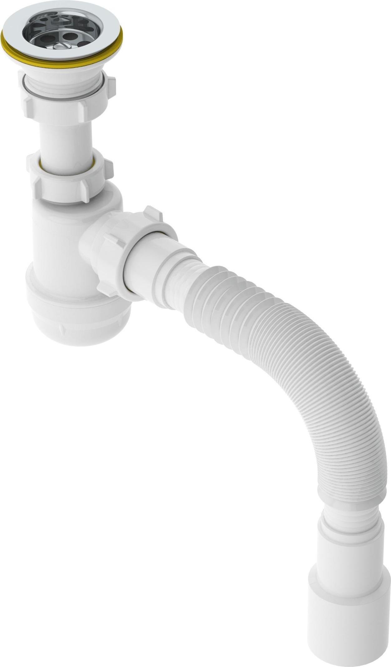 Малый сифон бутылочный Сандесант для моек и раковин со сливным отверстием 50 мм. Разборный выпуск 1½" без перелива комплектуется металлической решеткой 70 мм с креплением на винт 80 мм и шестигранную гайку М6. Компактный корпус диаметром 70 мм предназначен для установки в ограниченном пространстве. Соединение с отводным патрубком осуществляется через гайку 1¼" (внутренний диаметр 32 мм). Высота установки регулируется. В комплект входит гофротруба 40×50 мм для подключения к канализации. Все пластиковые элементы изготовлены из первичного белого полипропилена, устойчивого к температурам от +5°C до +80°C. Прокладки из материалов TPE, PVC и LDPE обеспечивают герметичность и долговечность. Возможна очистка без демонтажа, конструкция эффективно улавливает мелкие предметы. Скорость слива составляет 25 л/мин. Полная комплектация включает все необходимые компоненты для установки.